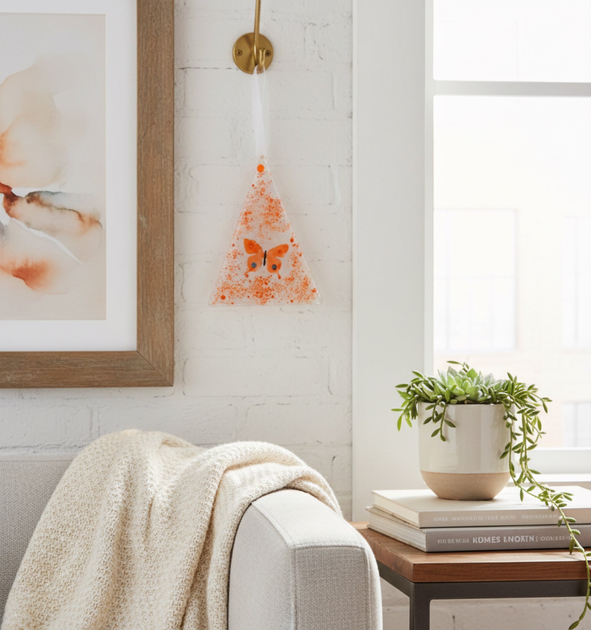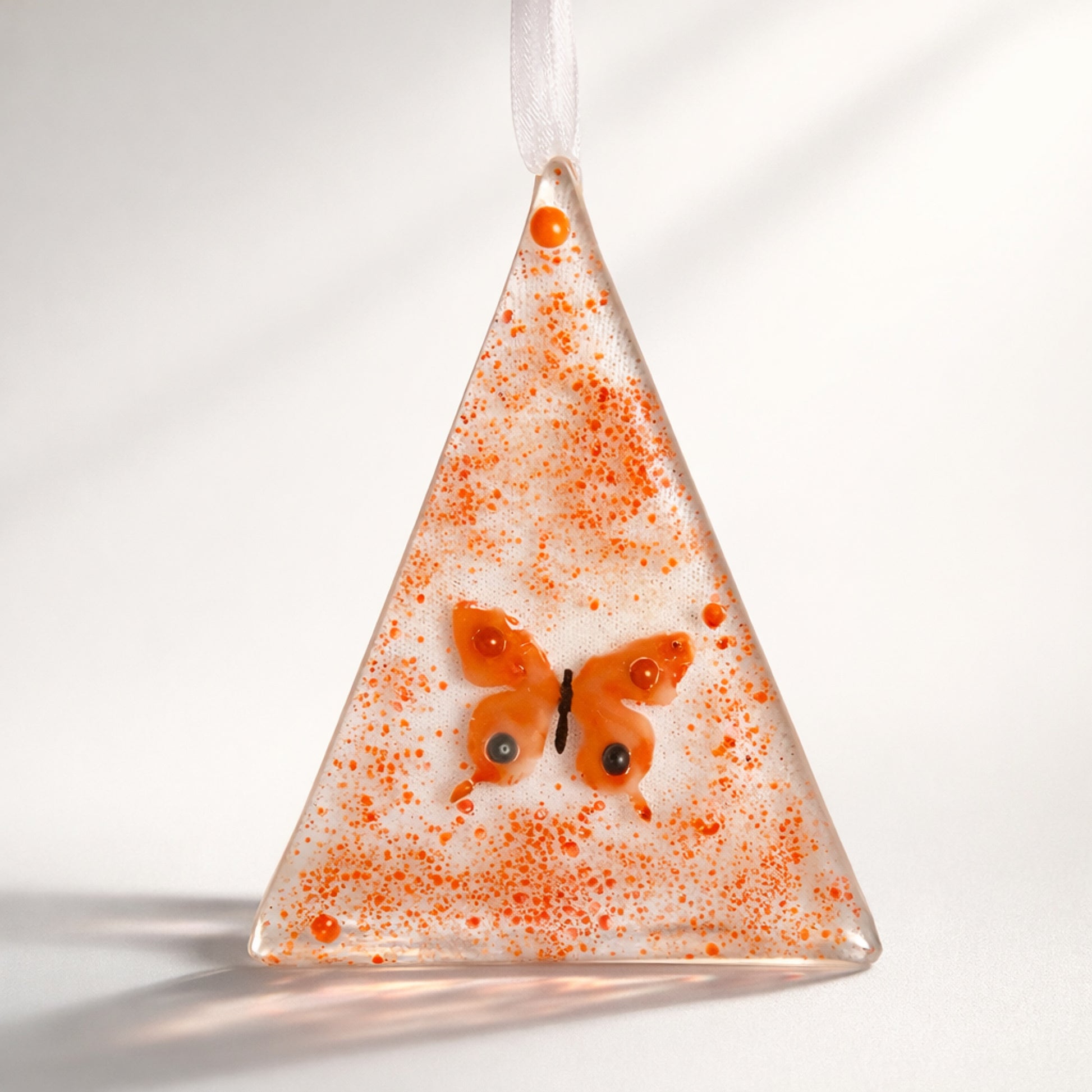 EN: A handcrafted fused-glass mini suncatcher with a bright orange butterfly inside warm confetti sparkle. Hang it by a window or on a hook — it brings a light, joyful feeling and a little “summer” to your space.