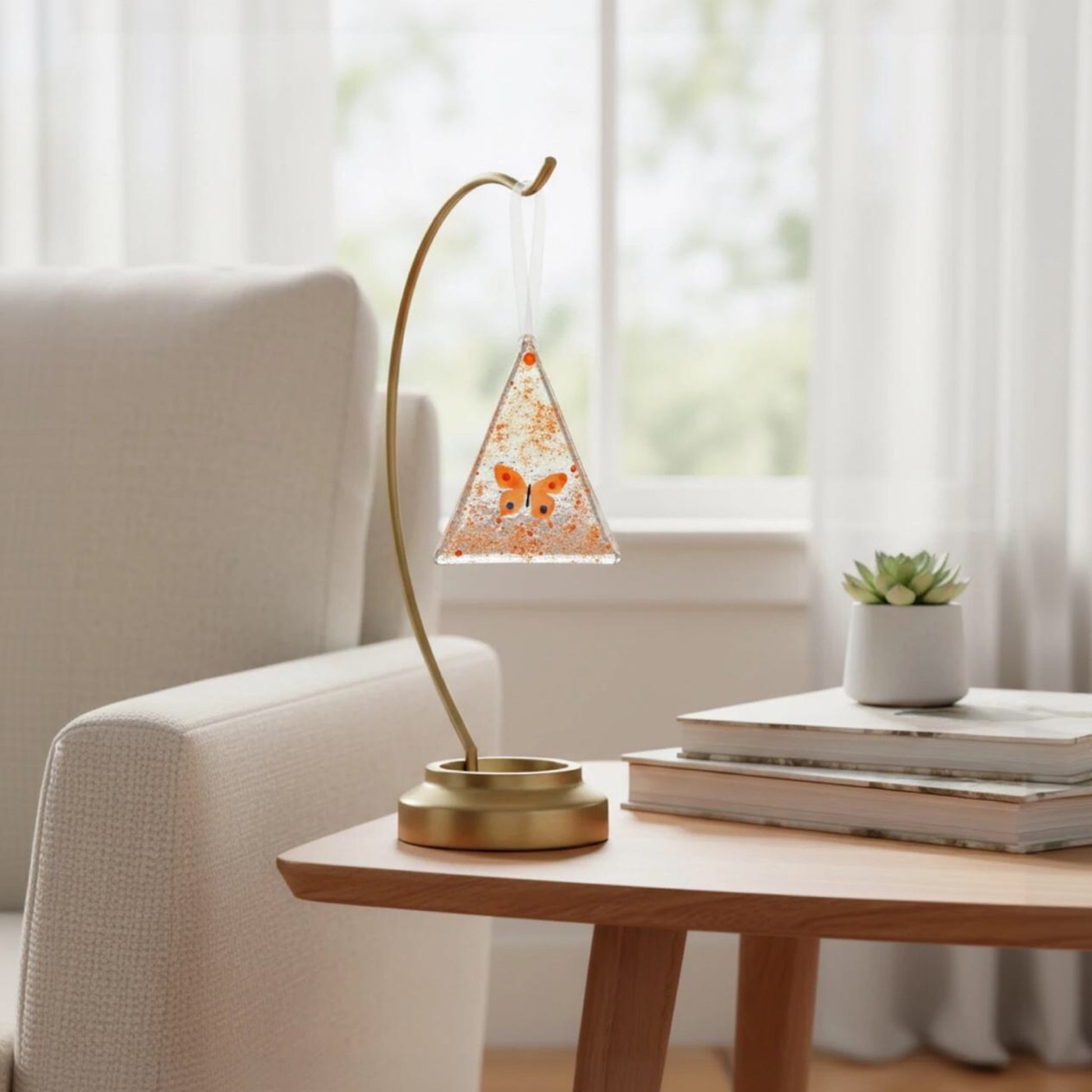 A tiny warm flutter in glass — it catches daylight and glows like a soft sunset.