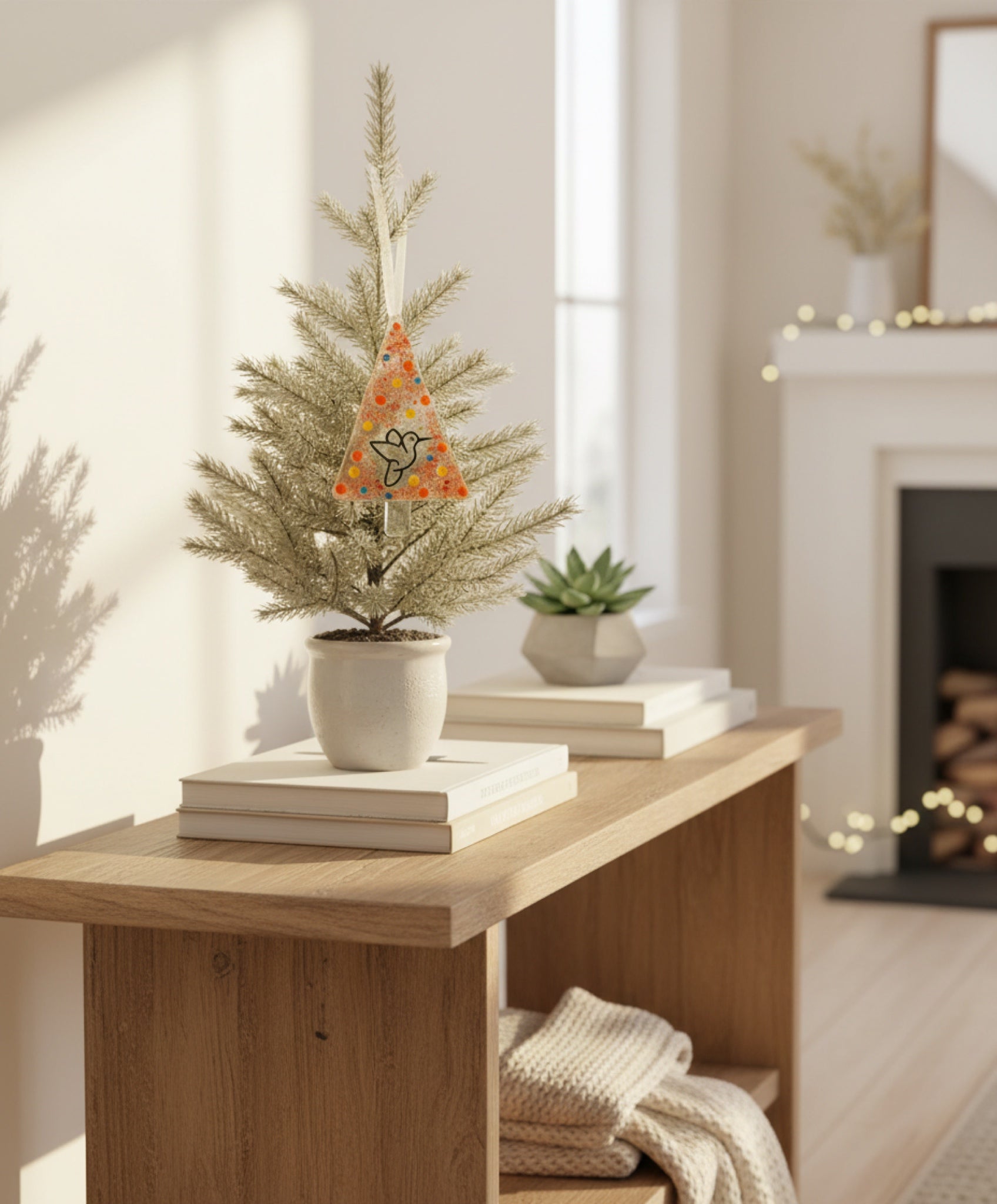 Hummingbird Dots Tree is a tiny piece of sunshine made for quiet, happy corners. Handcrafted from fused glass, it catches daylight and turns it into a warm glow on your wall, window, or shelf — like a gentle “good morning” every time the sun comes in.
