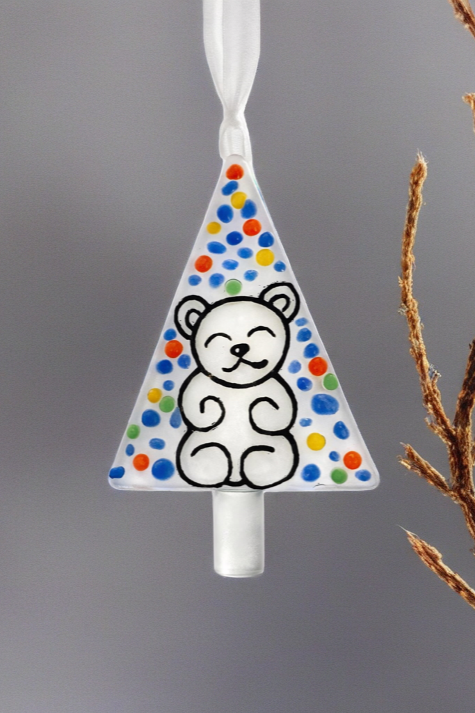 A clear glass “tree” with playful confetti dots and a smiling bear — bright, cute, and gift-ready. Each piece is made in small batches, so tiny variations are part of the charm.
