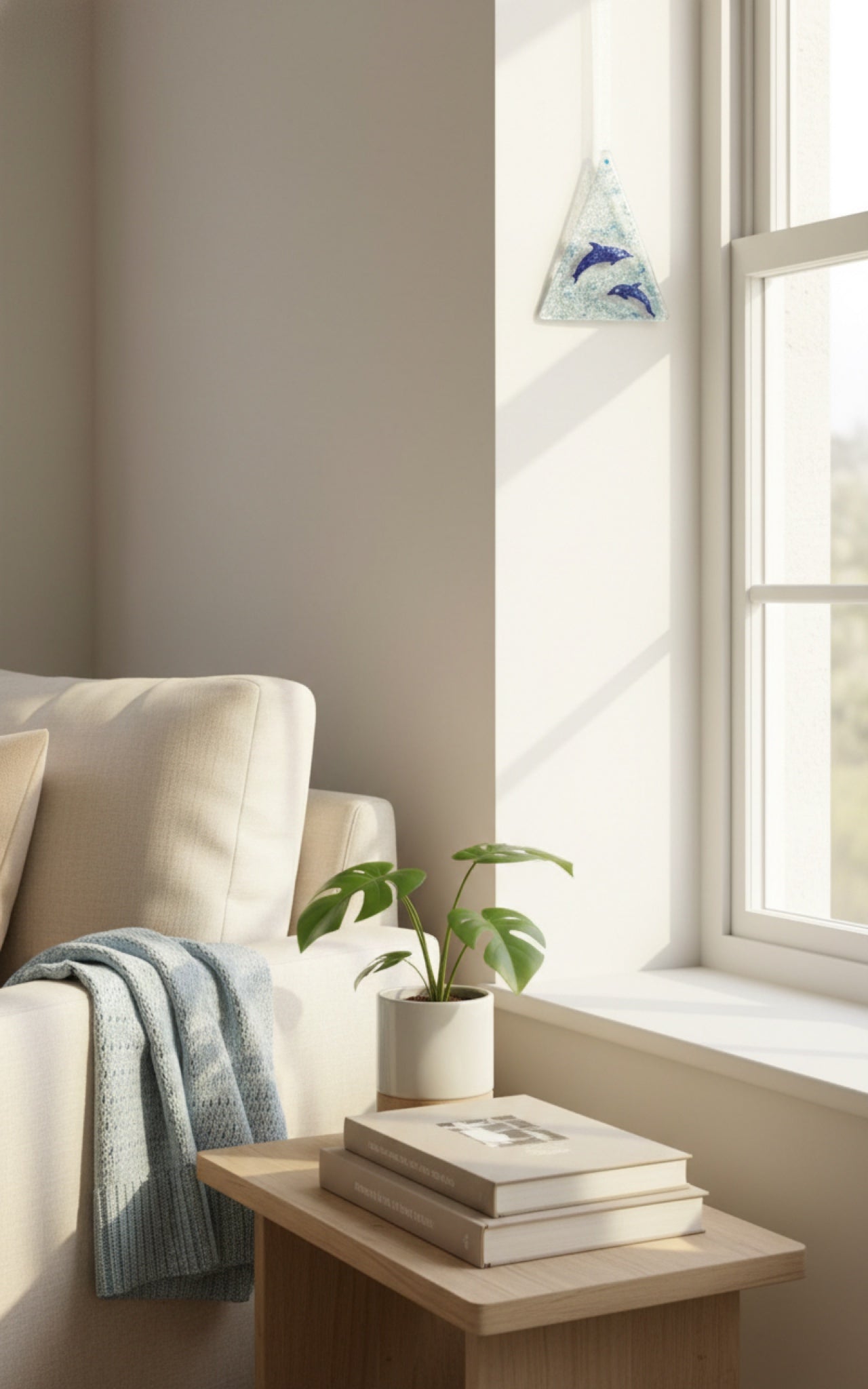 EN: A handcrafted fused-glass mini suncatcher in soft blue sparkle with two dolphins swimming inside. Hang it by a window or on a hook — it adds a fresh, peaceful feeling like a breath of seaside air.