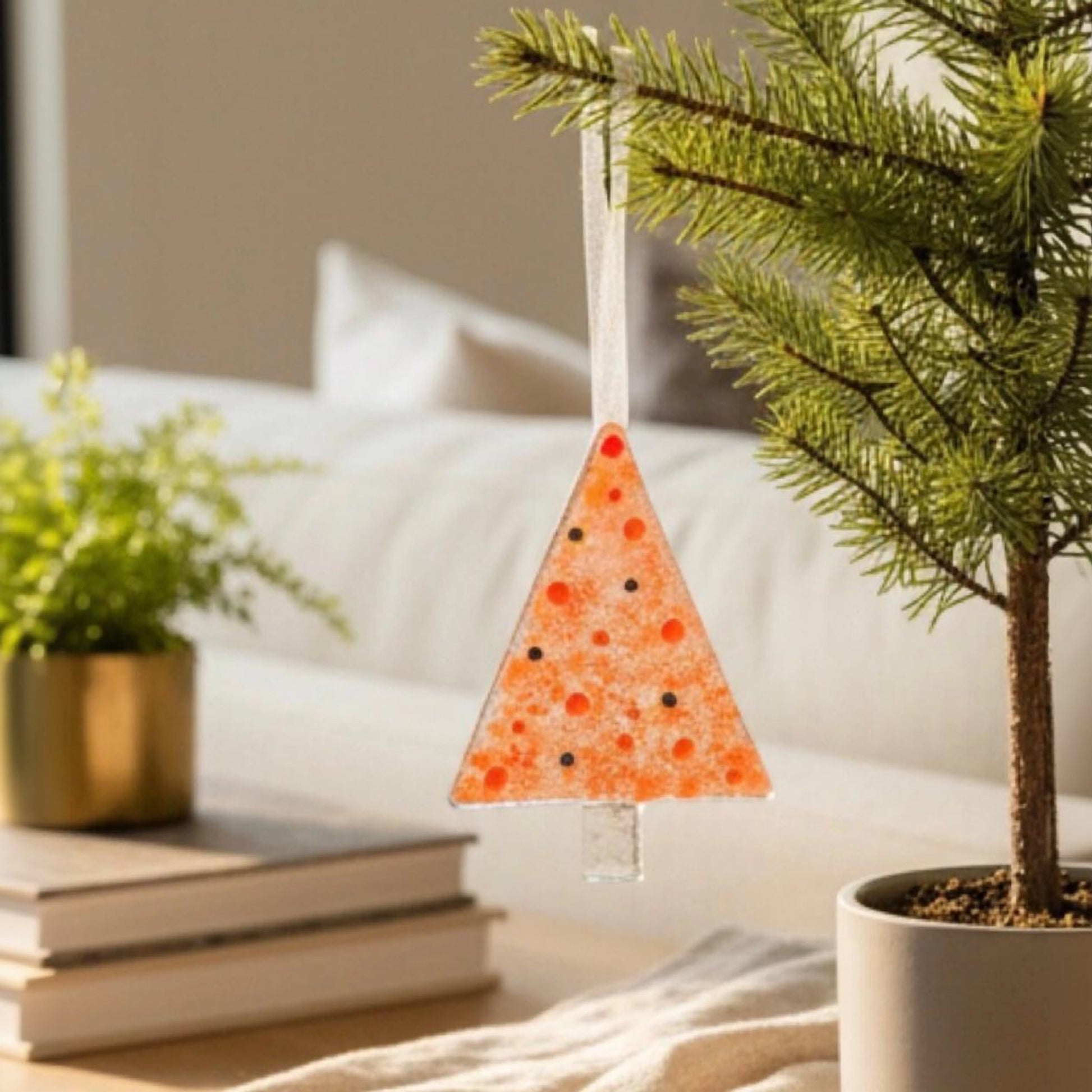 Tangerine is a tiny piece of sunshine for your home. Handcrafted from fused glass, it catches daylight and adds a warm, cozy glow to your window, shelf, or favorite corner. The soft “confetti” dots make every piece feel playful and unique — like a small wish for comfort and good mood, every day.