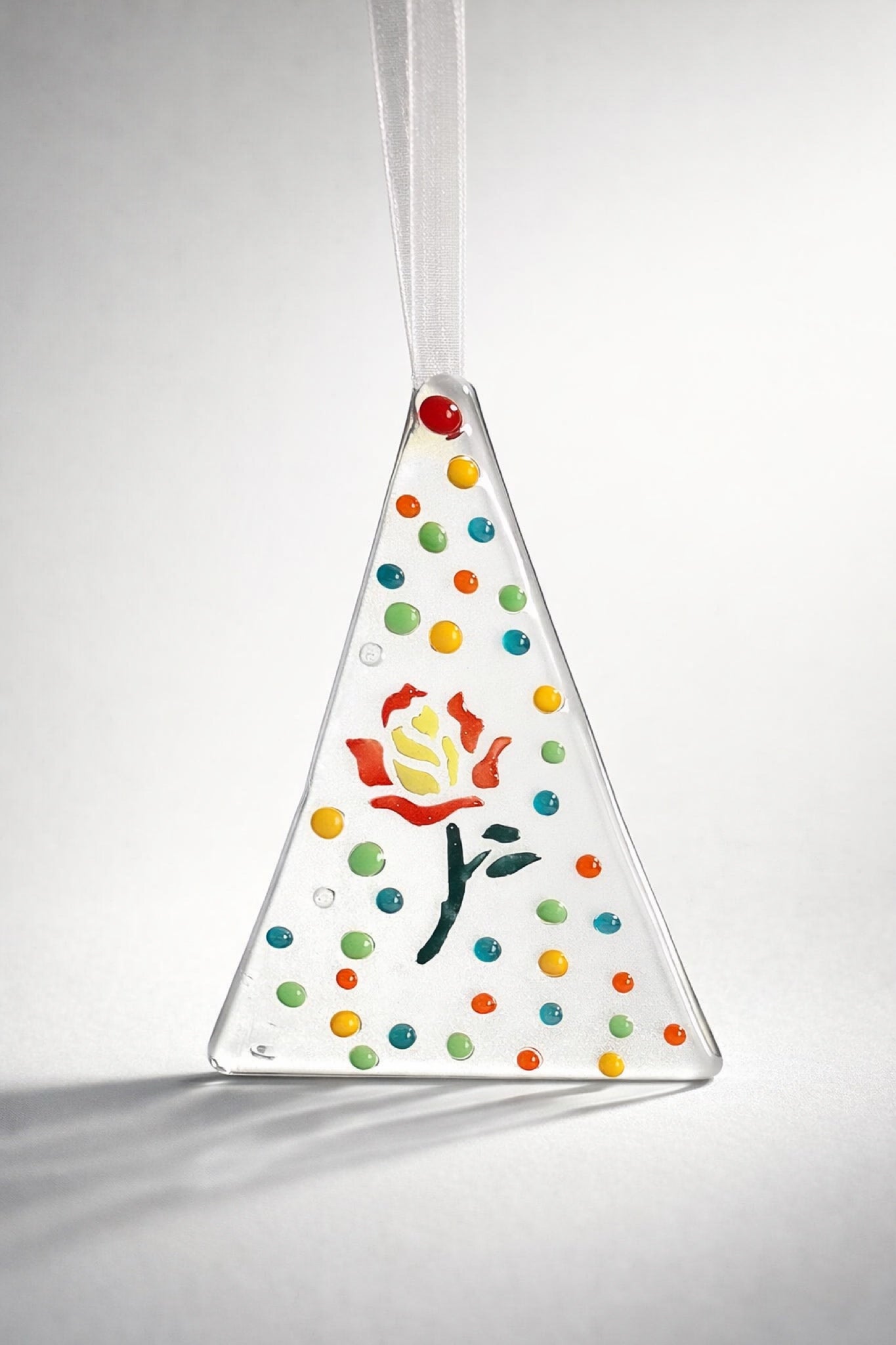 EN: A delicate fused-glass mini suncatcher with bright confetti dots and a little flower detail. Hang it by a window, on a hook, or in a cozy corner — it brings a playful sparkle and a gentle, happy mood.