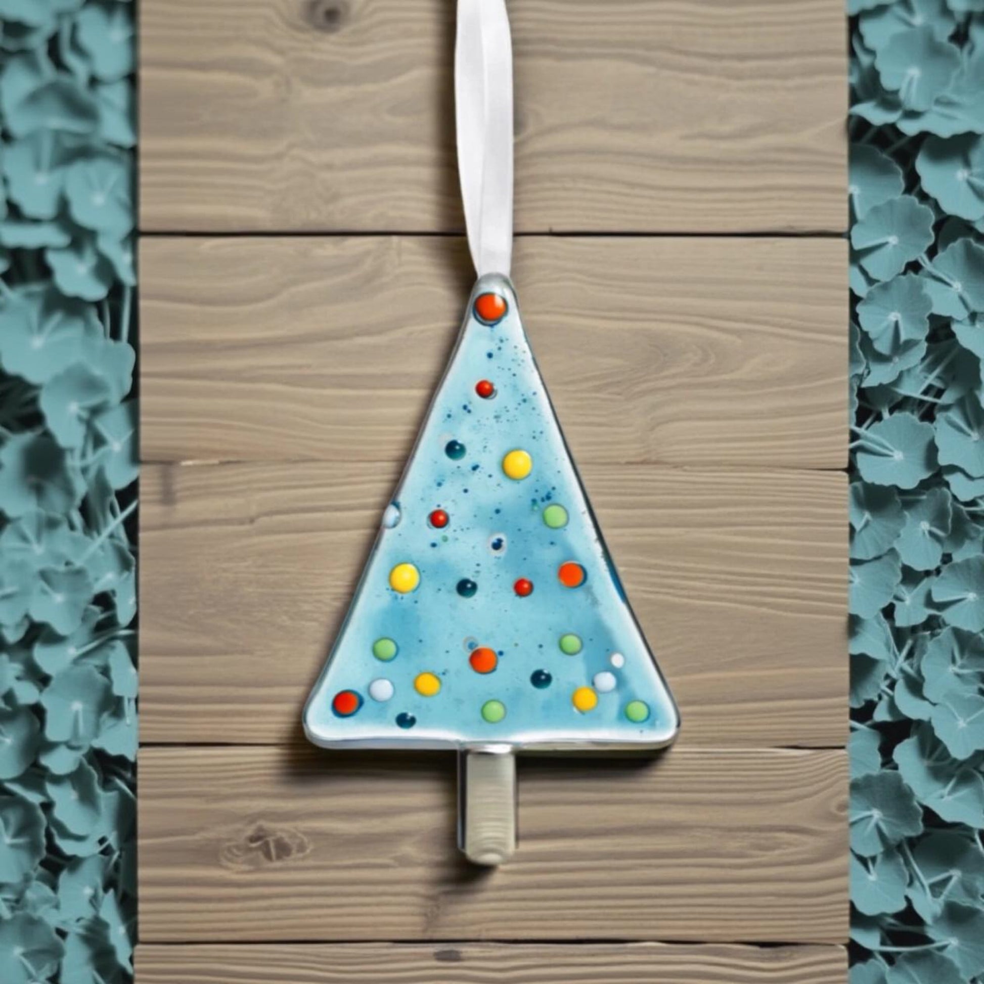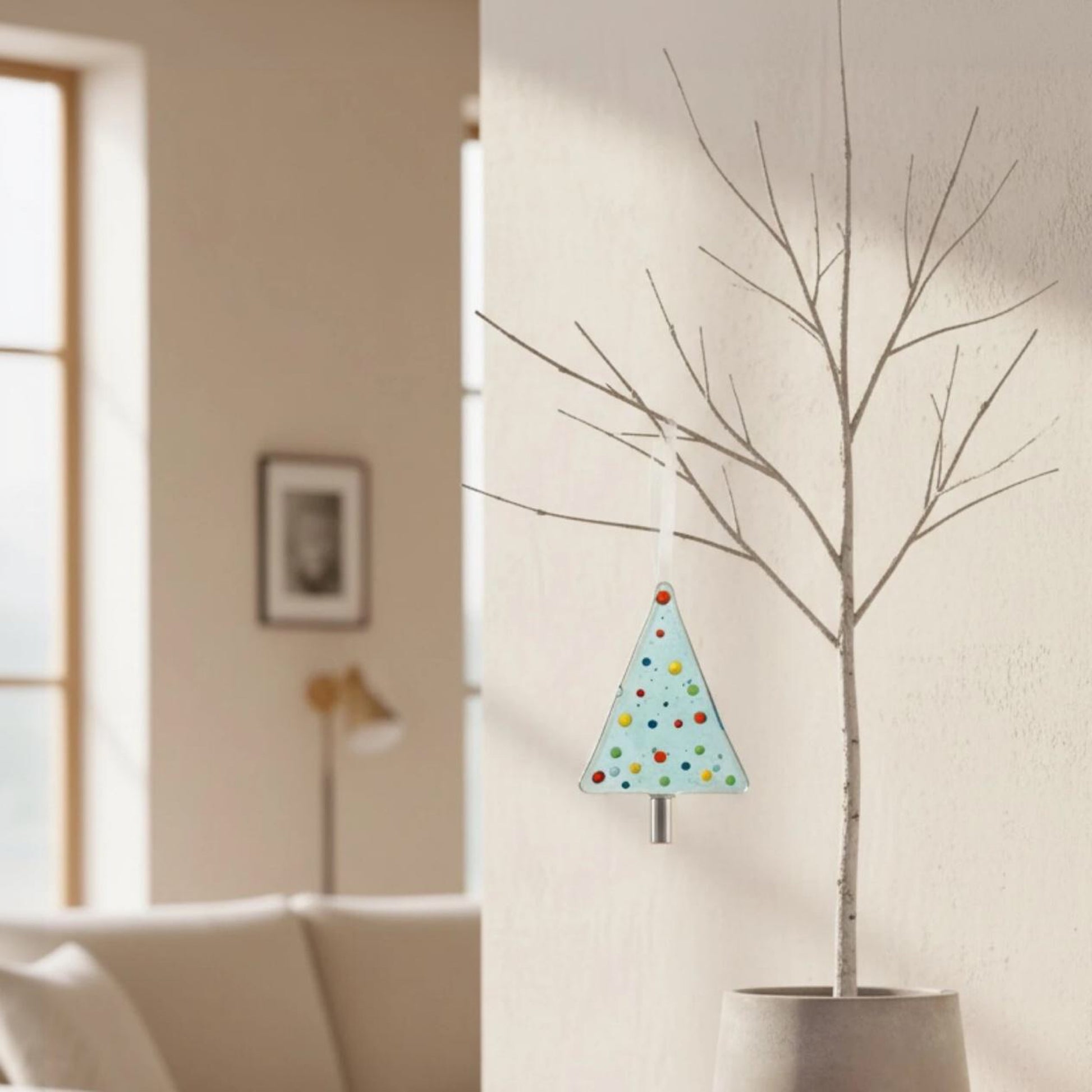 A light sky-blue tree with bright confetti dots — airy, cheerful and gift-ready. Each piece is made in small batches, so tiny variations are part of the charm.