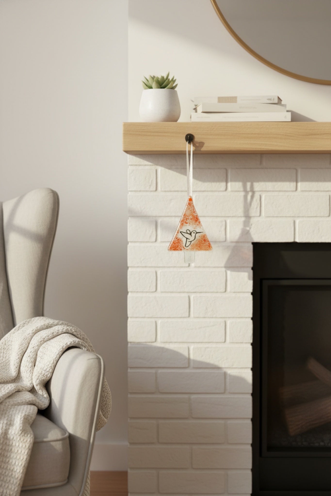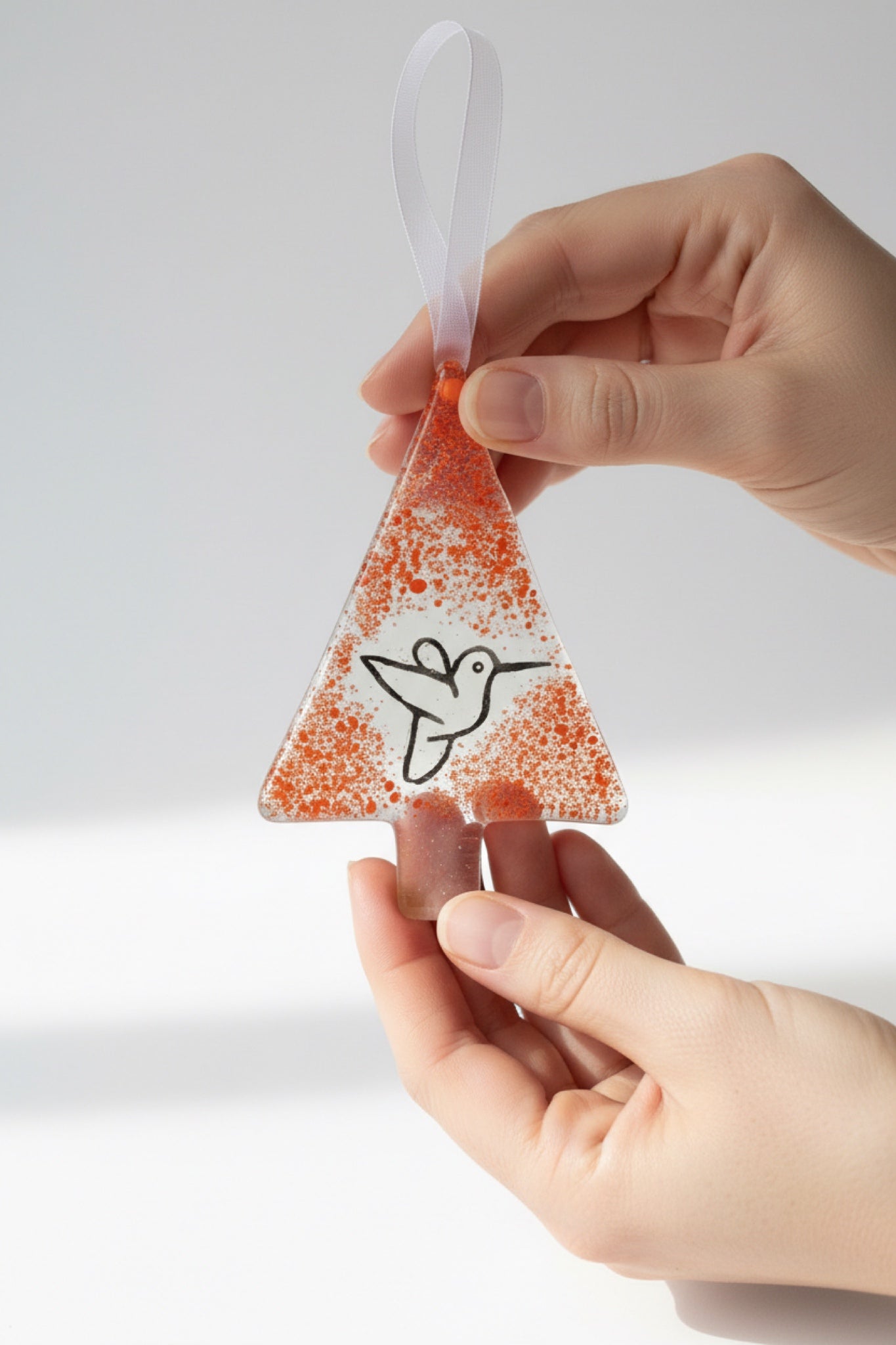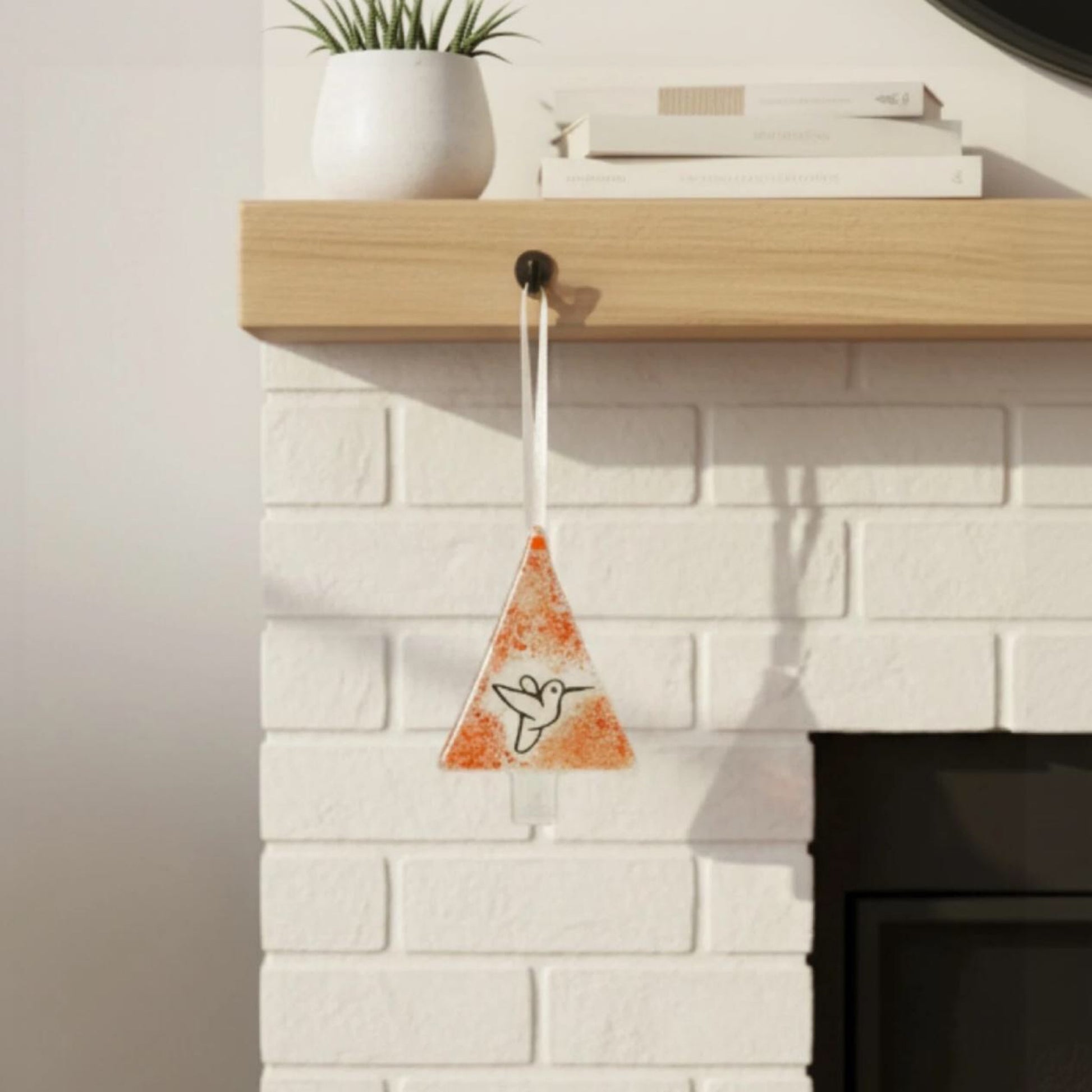 Tangerine Hummingbird is a tiny piece of sunshine for your home. Handcrafted from fused glass, it catches daylight and adds a warm, cozy glow to your window, shelf, or favorite corner. The soft “confetti” dots make every piece feel playful and unique — and the hummingbird detail adds a gentle symbol of lightness and everyday joy.